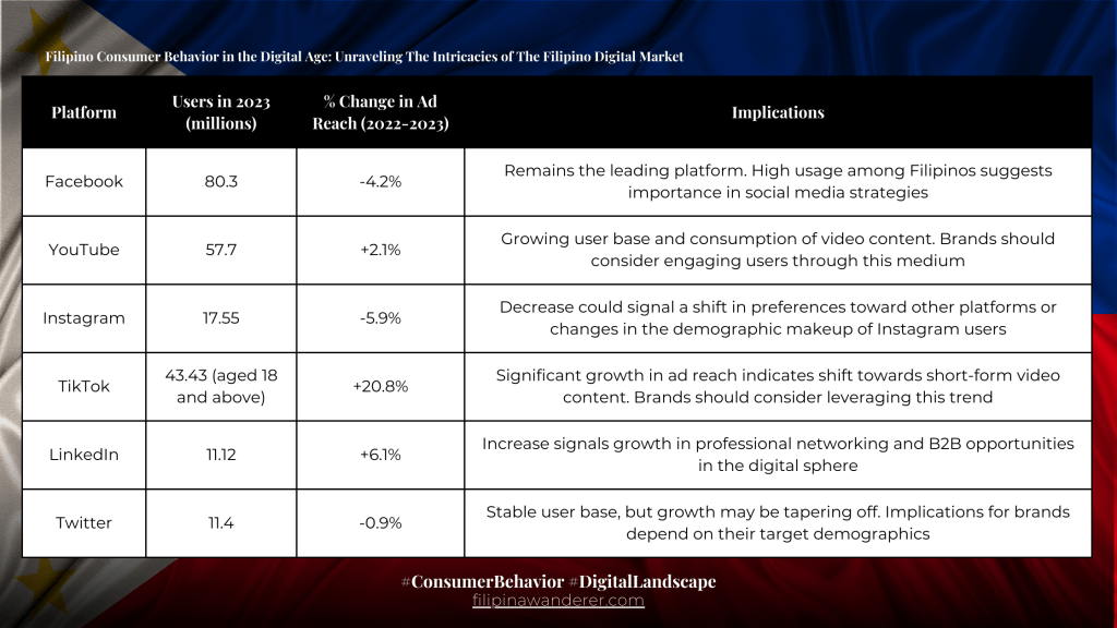 Social media platforms play a significant role in the Filipino digital landscape. DataReportal’s 2023 report highlights Facebook, YouTube, Instagram, TikTok, LinkedIn, and Twitter as key platforms in the Philippines, with varying levels of adoption and growth.